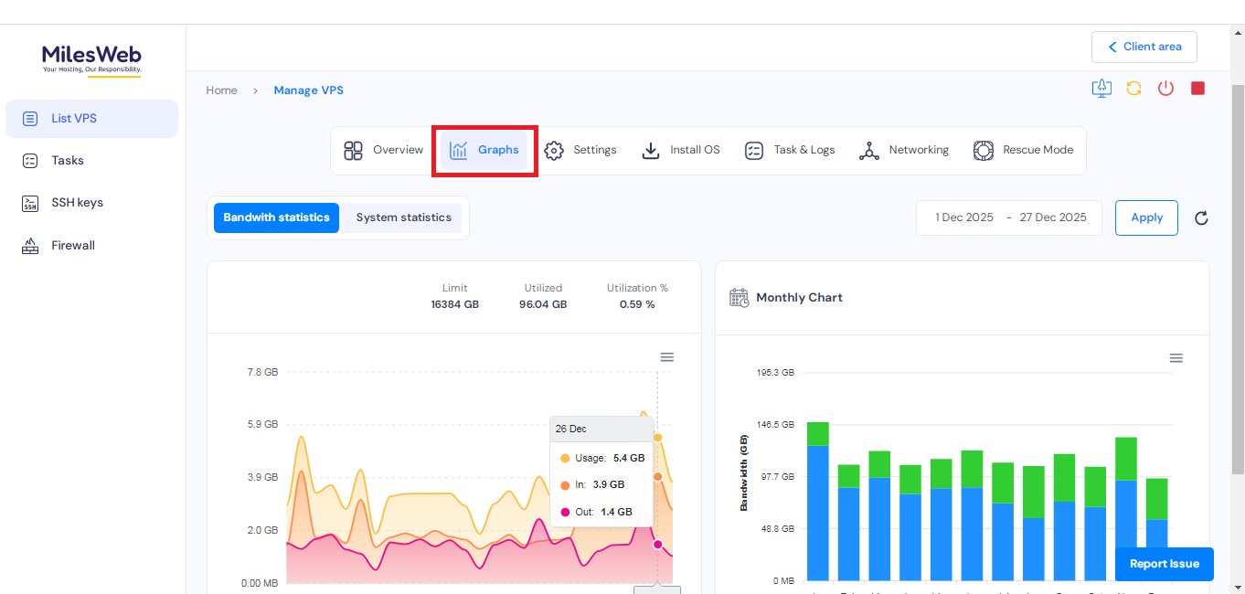 Under the Manage VPS section, navigate to Graphs to monitor server performance in detail. Here, you can: