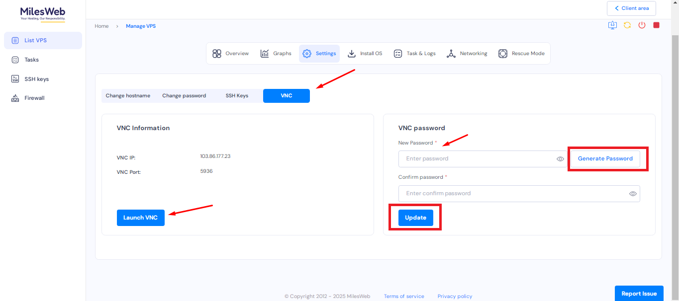 - To change the VNC password, click on Generate Password to create a new one or enter a custom password.