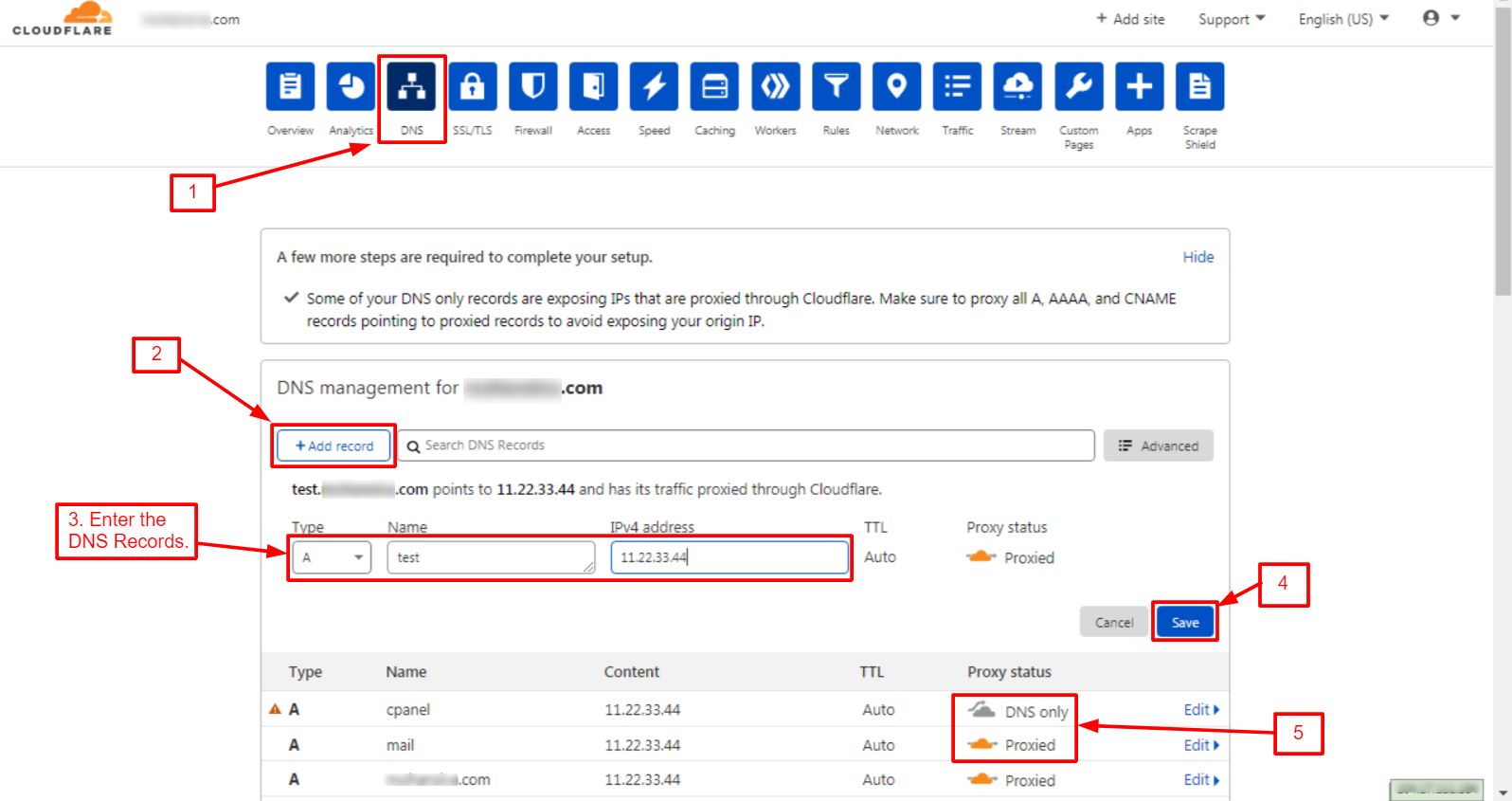 5. To deactivate or activate the Cloudflare service for a DNS record, click on the orange/grey cloud under its Proxy status.