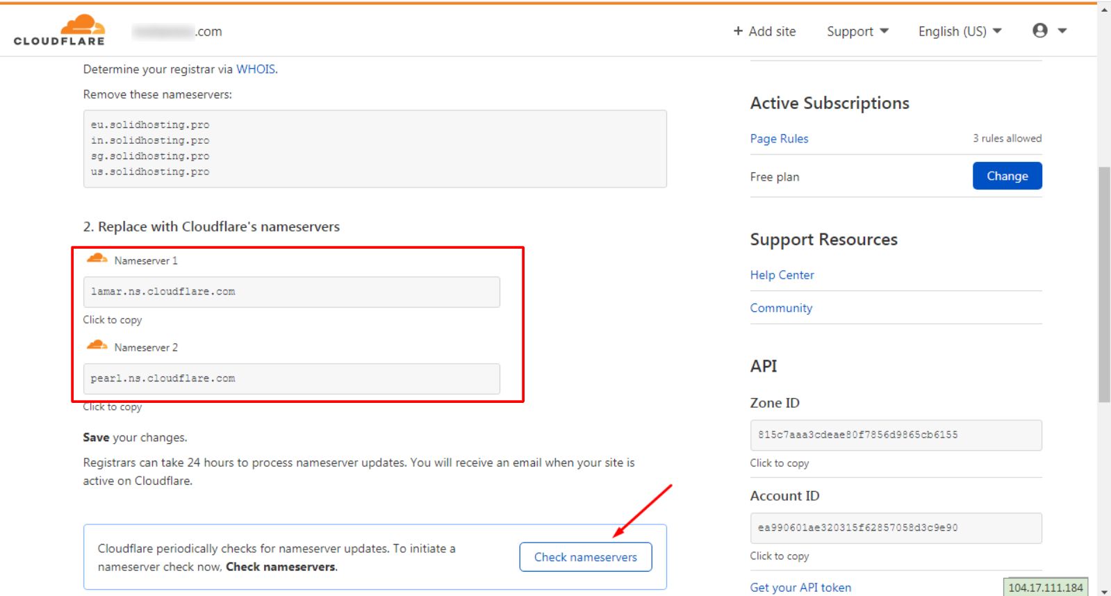 7. Scroll down and the nameservers you specified in the Clientarea will show up under the Replace with Cloudflare’s nameservers section. Click the Check nameservers button below.