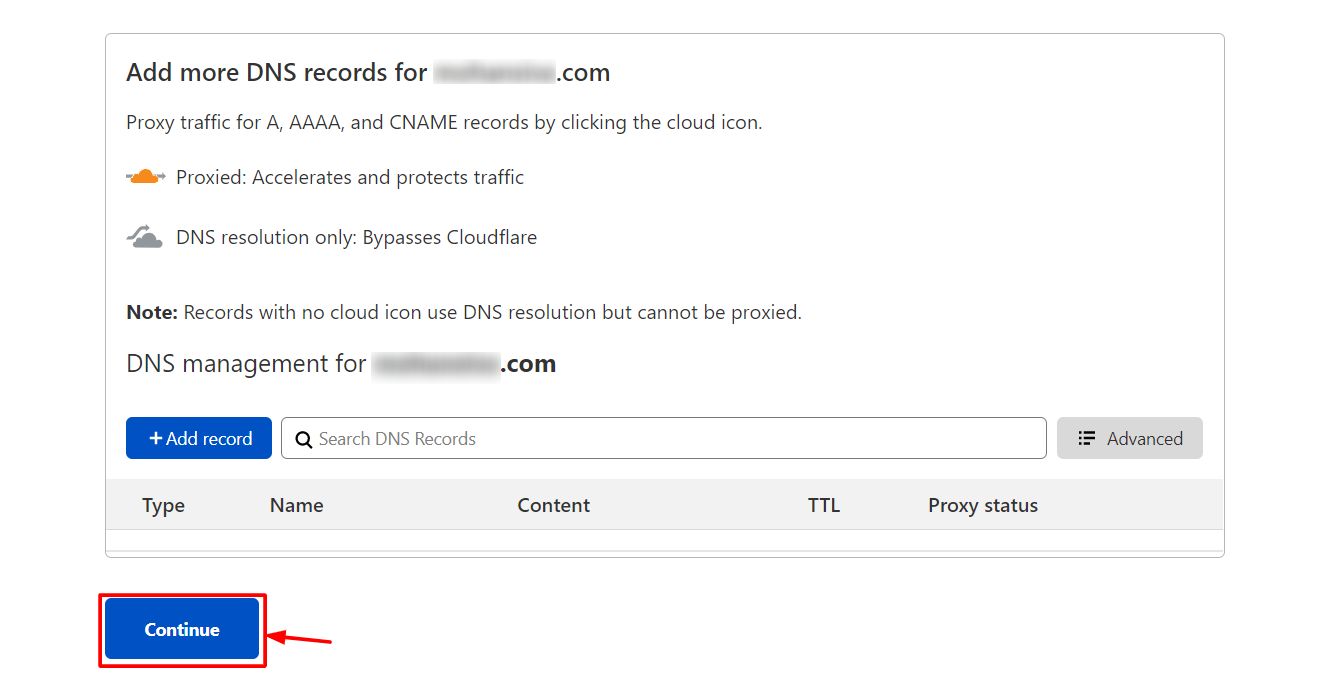 Warning: Before proceeding further, make sure to double-check if the list of DNS records matches your cPanel records. If you find anything missing or out of place, contact your provider immediately. Additionally, we do not recommend modifying DNS records here. You can do that after you complete the setup.