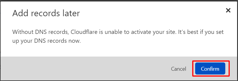 6. If you have just set up your domain and have no DNS records, a popup window will appear asking you to set up DNS records. Click the Confirm button.