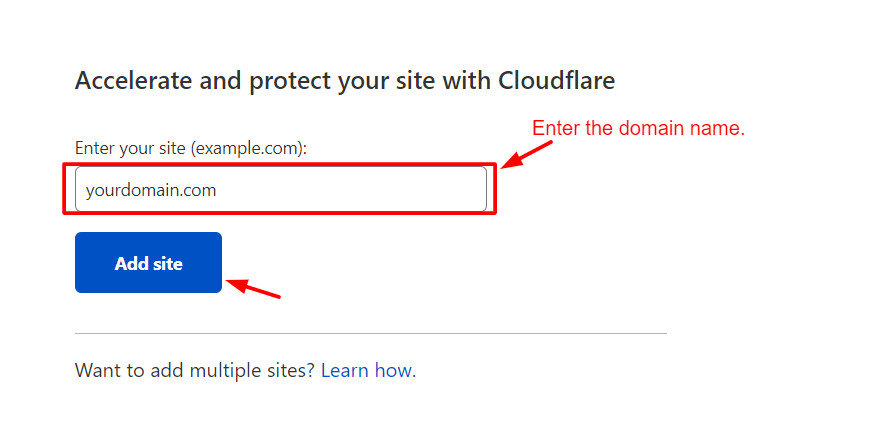 3. Enter the domain name for which you want to enable Cloudflare under the Enter your site field and click the Add site button.