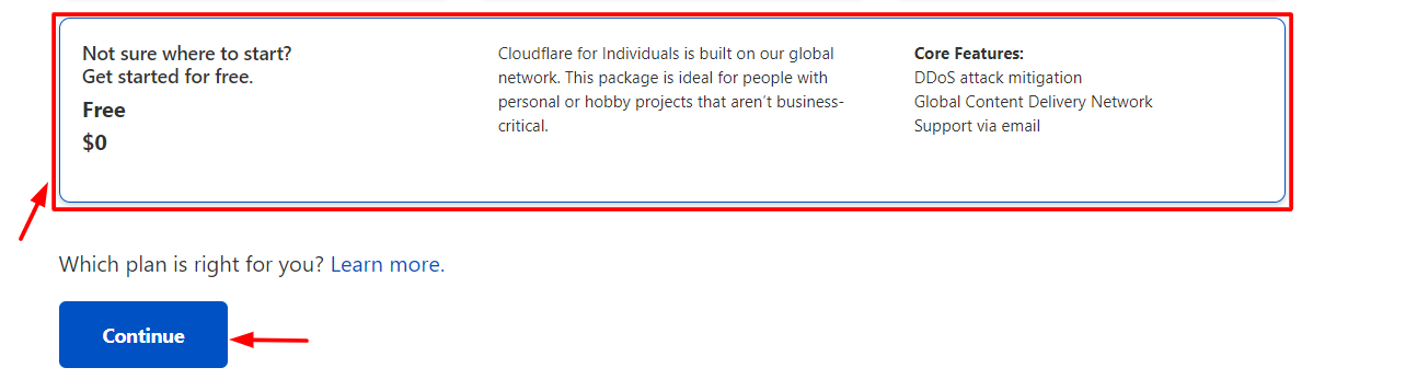 Cloudflare will redirect you to a page to choose a CDN plan.