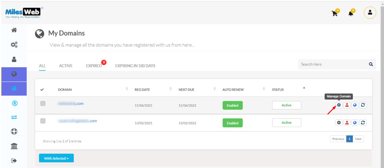 4. Click the Manage Domain icon for the domain name that you have to point to Cloudflare DNS.