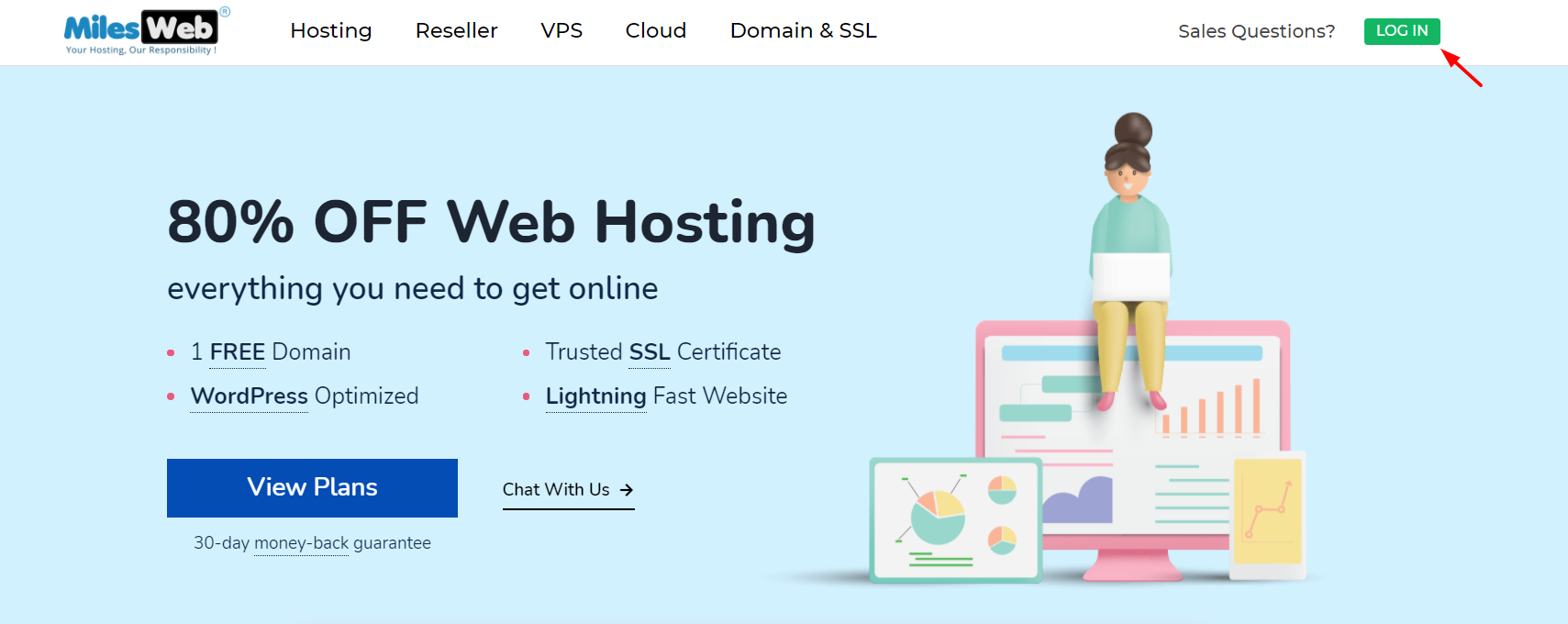 1. Browse the MilesWeb website in a new tab and click the LOG IN button to the top-right corner of your screen.