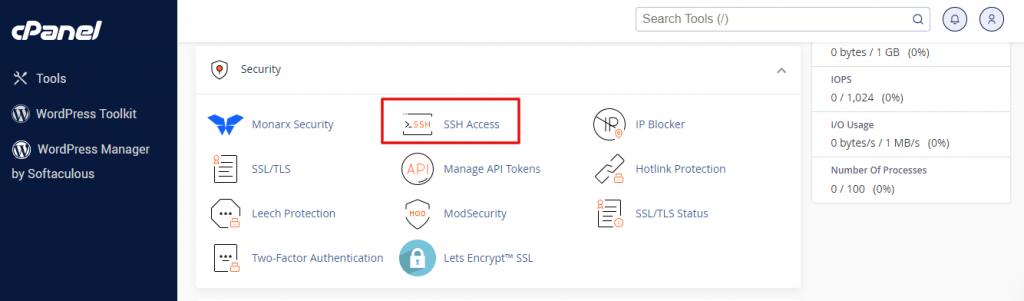 - If you are currently using the Jupiter theme, on the Tools page, in the Security section, click on SSH Access.