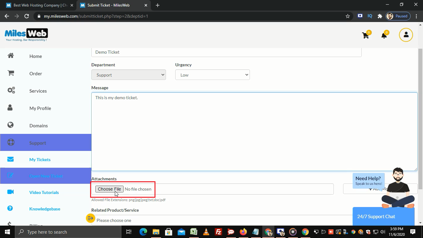 - If you want to attach any file along with the ticket then, click here to select the file.