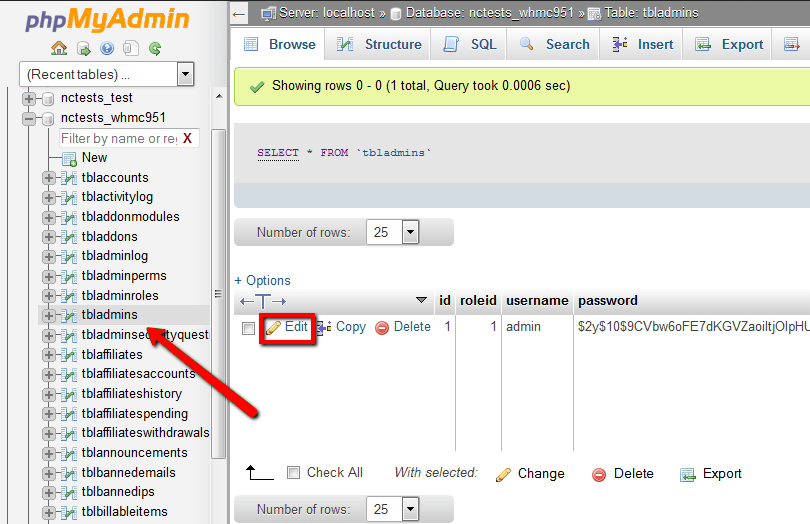 4. Next you need to search for the table “tbladmins”. Once you select the table, click on “Browse” and then find the administrator for which you want to change the password and click on “Edit”.