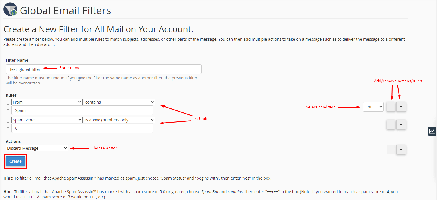 The system will set the Global Email Filter and flash a success message. These filters will apply to all email accounts under your cPanel account.